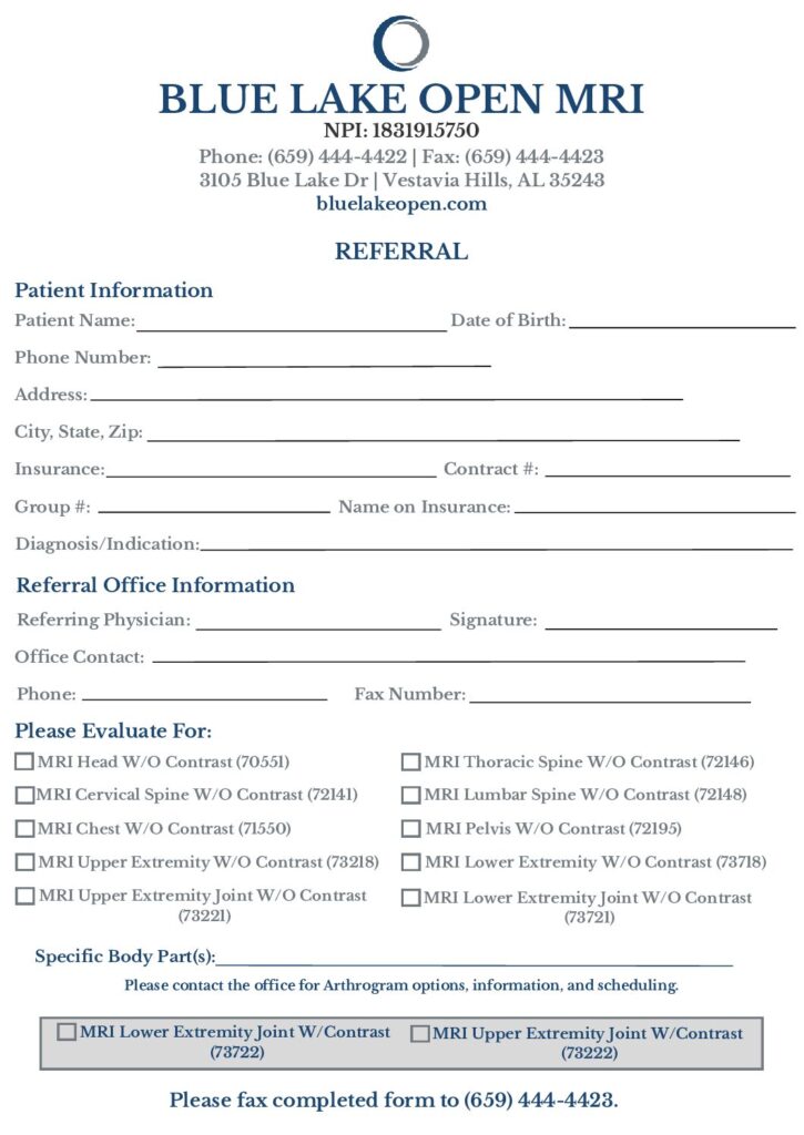 Below is our provider referral form for Blue Lake Open MRI. For a downloadable PDF, click on the link below and fax the completed form to our office, using the fax number provided.